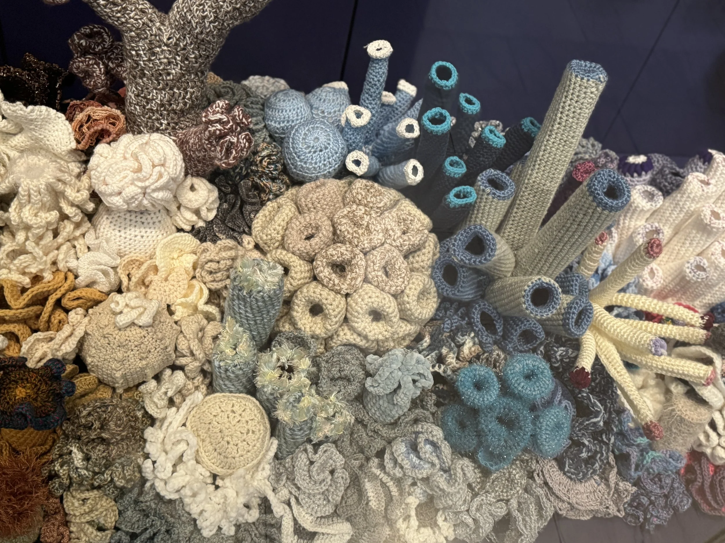 A tactile, immersive installation of crocheted coral transforms perception into a participatory meditation, echoing trends in wellness home decor with textured, grounding artwork.